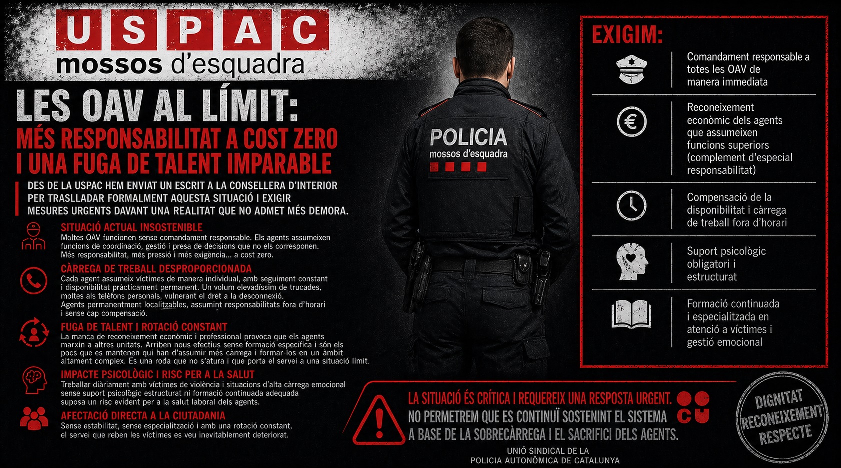 En aquest sentit, des de la nostra organització sindical ja hem registrat un escrit adreçat a la Consellera d’Interior per traslladar formalment aquesta problemàtica i exigir mesures urgents davant una situació que no admet més demora.