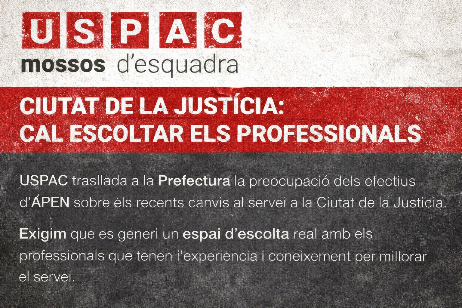 Volem deixar molt clar que la USPAC no entra ni entrarà a valorar la concreta operativa policial. No és la nostra funció determinar com s’ha de distribuir el servei ni com s’han d’assignar tasques. Però sí que és la nostra responsabilitat sindical advertir quan els efectius afectats, de manera seriosa i argumentada, posen sobre la taula que determinades decisions no estan contribuint a millorar el funcionament diari i poden acabar afectant tant la coordinació com el benestar laboral.