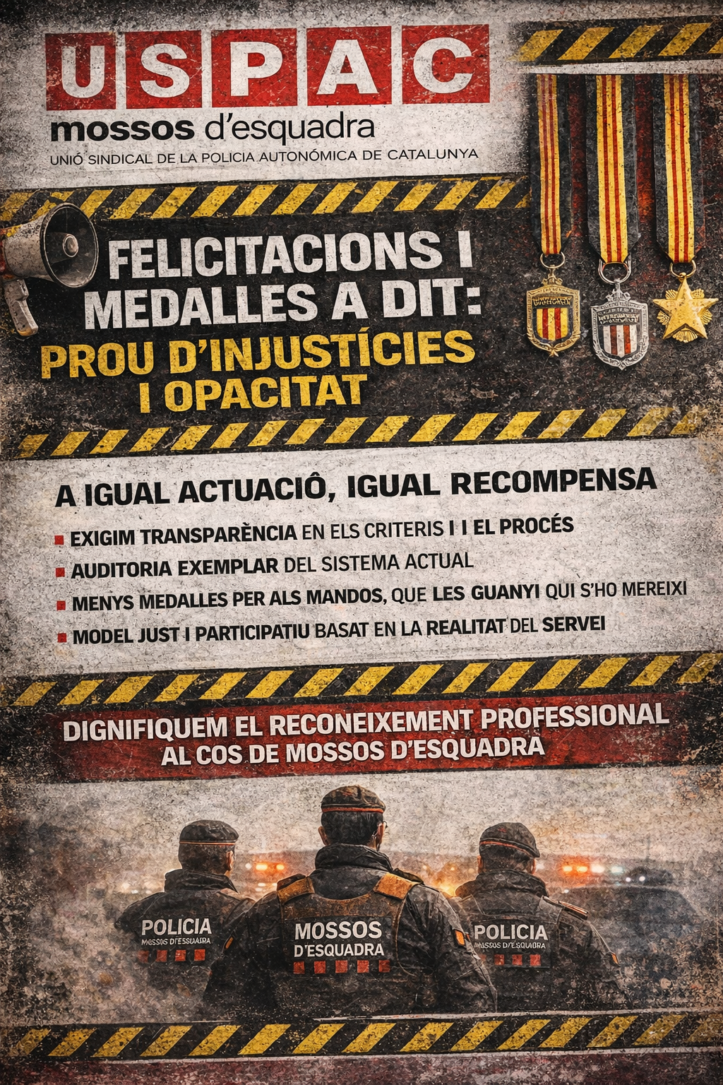 Des de la USPAC tornem a denunciar, amb tota contundència, una problemàtica estructural que fa anys que arrosseguem i que lluny de corregir-se, s’ha consolidat com una de les principals fonts de malestar dins del Cos de Mossos d’Esquadra: el sistema de concessió de felicitacions i medalles.
