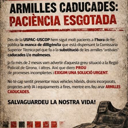 Des de la USPAC-USCOP hem sigut molt pacients a l’hora de fer pública la manca de dil·ligència que està dispensant la Comissaria Superior Tècnica pel que fa a la substitució de les armilles “antibales” caducades i/o malmeses.