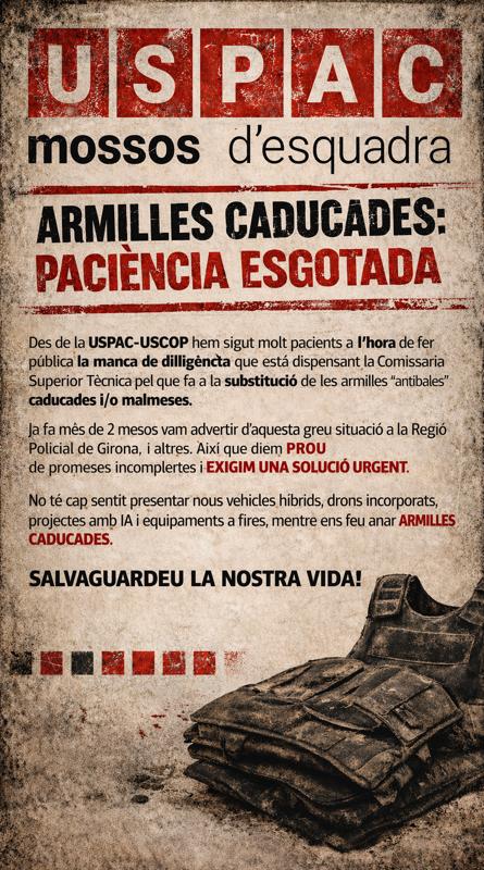 Ja fa més de dos mesos que des de la nostra organització sindical s’ha posat en coneixement de la Comissaria Superior Tècnica que un nombre important dels mossos/es de la Regió Policial de Girona tenien les seves armilles caducades o malmeses, molts d’ells des de feia més d’un any.
